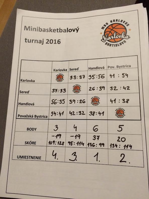 Svoje prvé stretnutie odohrali naši minibasketbalisti proti Seredi. Stretnutie bolo po celý čas napínavé a skončilo tesnou prehrou domáceho tímu 33:37. "Veľmi nás mrzí výsledok tohto zápasu. Nebyť našich zbytočných chýb a mať trochu presnejšiu streľbu, súpera by sme porazili," konštatovala po stretnutí D. Zambová. Druhý oponent Karlovky Považská Bystrica vybehol na súperov s celoplošnou obranou, čo spôsobilo každému veľké problémy. Ani Karlovka sa nevyhla "zahodeniu" niekoľkých dôležitých lôpt do autu a napokon prehrala 41:54. Proti víťazovi z Handlovej predviedli minibasketbalisti podľa Ľ. Fáberovej paradoxne najlepší výkon, hoci bodový deficit bol najvyšší - 35:56. "Chcem vyzdvihnúť výkon dvoch našich hráčov, a to Kuba Fraňa a Sama Bačiaka, ktorí odohrali vynikajúce zápasy a boli oporou družstva," zhodnotila Ľ. Fáberová.